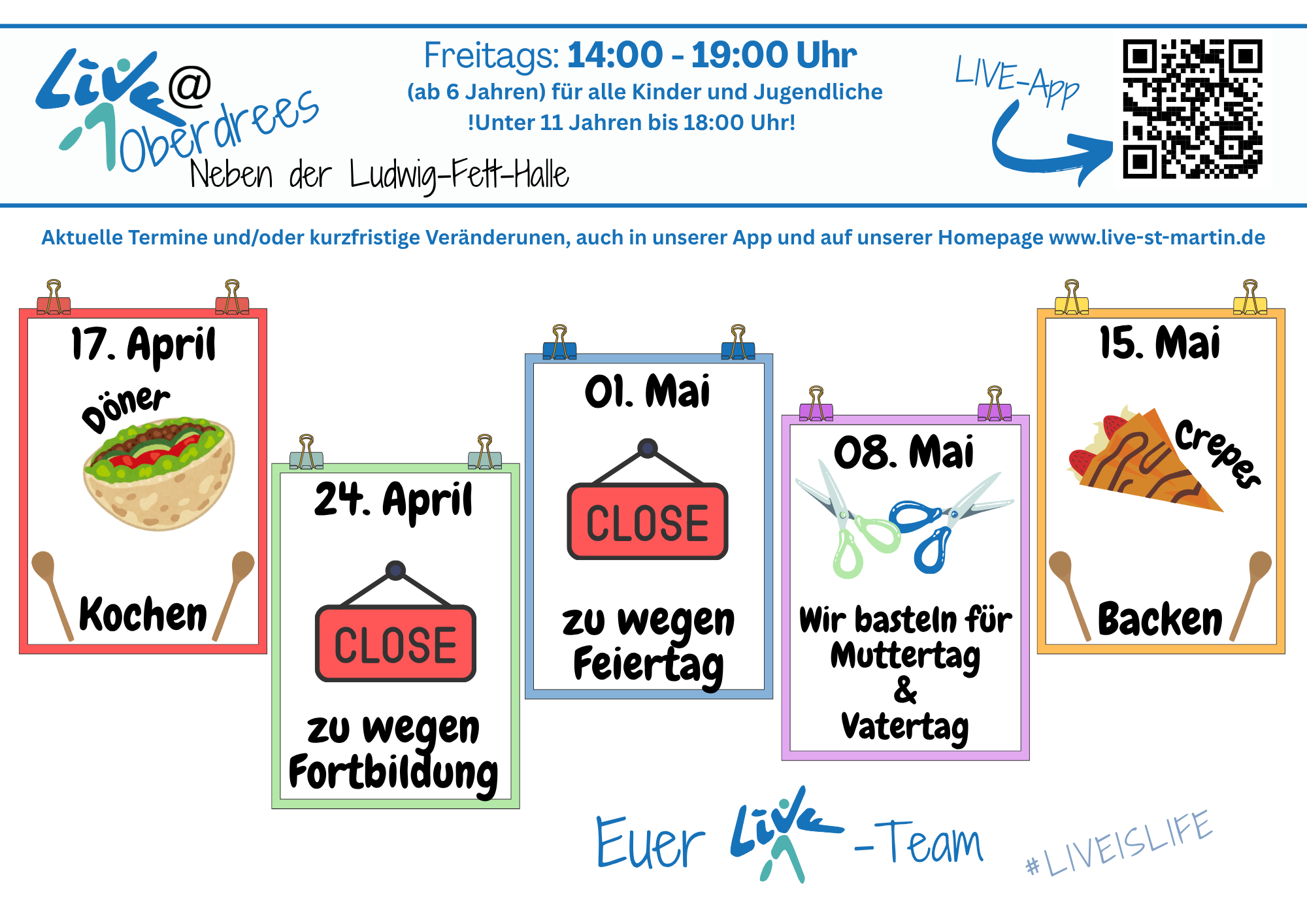 Einfach den QR- Code scannen oder uns direkt im Internet besuchen: https://live-kinder-und-jugendzentrum.zur.app/